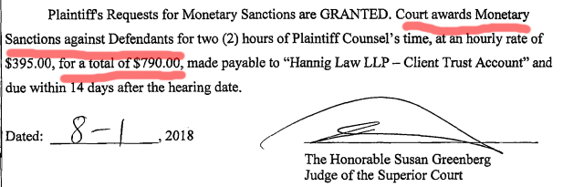 But then the error, in our opinion, is compounded by requesting a court hearing. The judge did not seem to be amused as she changed her tentative ruling from no sanctions to imposing $790 in sanctions upon defendants.