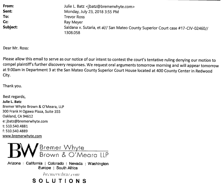 The email sent, five minutes before the deadline, by Bremer Whyte Brown and O'Meara said "Please allow this email to serve as our notice of our intent to contest the court's tentative ruling denying our motion to compel plaintiff's further discovery responses. We request oral arguments tomorrow morning and will appear tomorrow at 9:00am in Department 3 at the San Mateo County Superior Court House located at 400 County Center in Redwood City."
