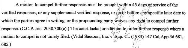 Over six months later defendants filed a motion to compel. The judge said the motion had to be filed within 45 days unless the parties agreed in writing to a specific later date. There was no agreement and attorney Ahmad could point to no specific later date allowing the motion.