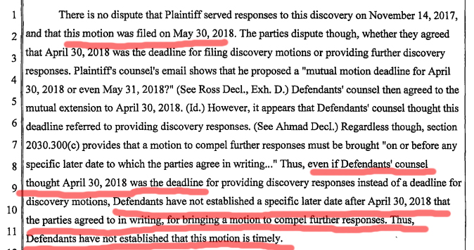 Attorney Ahmad, though, filed a motion to compel over six months later on May 30, 2018.