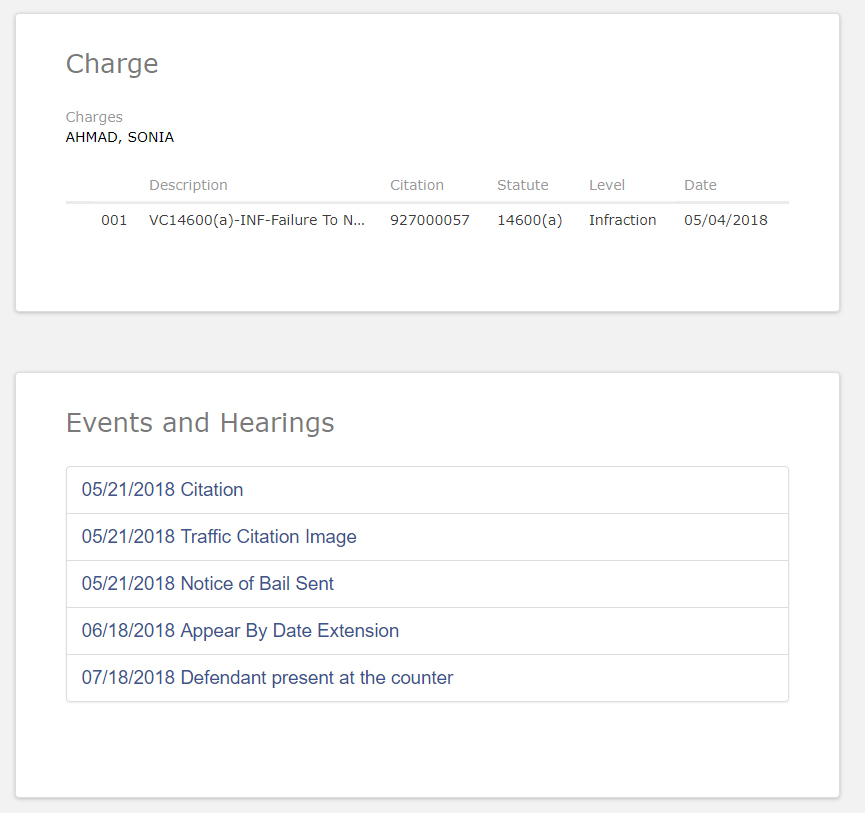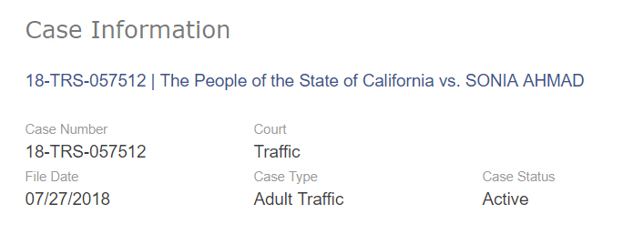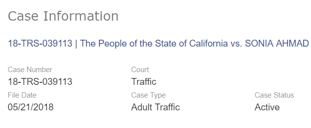 The People of the State of California vs. SONIA AHMAD - May 21, 2018 - Charge of violating Vehicle Code section 14600(a) "Whenever any person after applying for or receiving a driver's license moves to a new residence, or acquires a new mailing address different from the address shown in the application or in the license as issued, he or she shall within 10 days thereafter notify the department of both the old and new address."