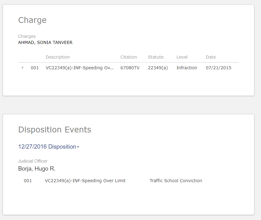 The People of the State of California vs. SONIA TANVEER AHMAD - August 3, 2015 - Charge of violating Vehicle Code section 22349(a) "(a) Except as provided in Section 22356, no person may drive a vehicle upon a highway at a speed greater than 65 miles per hour."