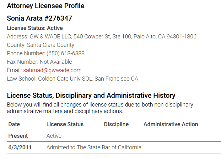 Sonia Arata / Sonia Ahmad was admitted to the California Bar in 2011. Bar Number 276347.
